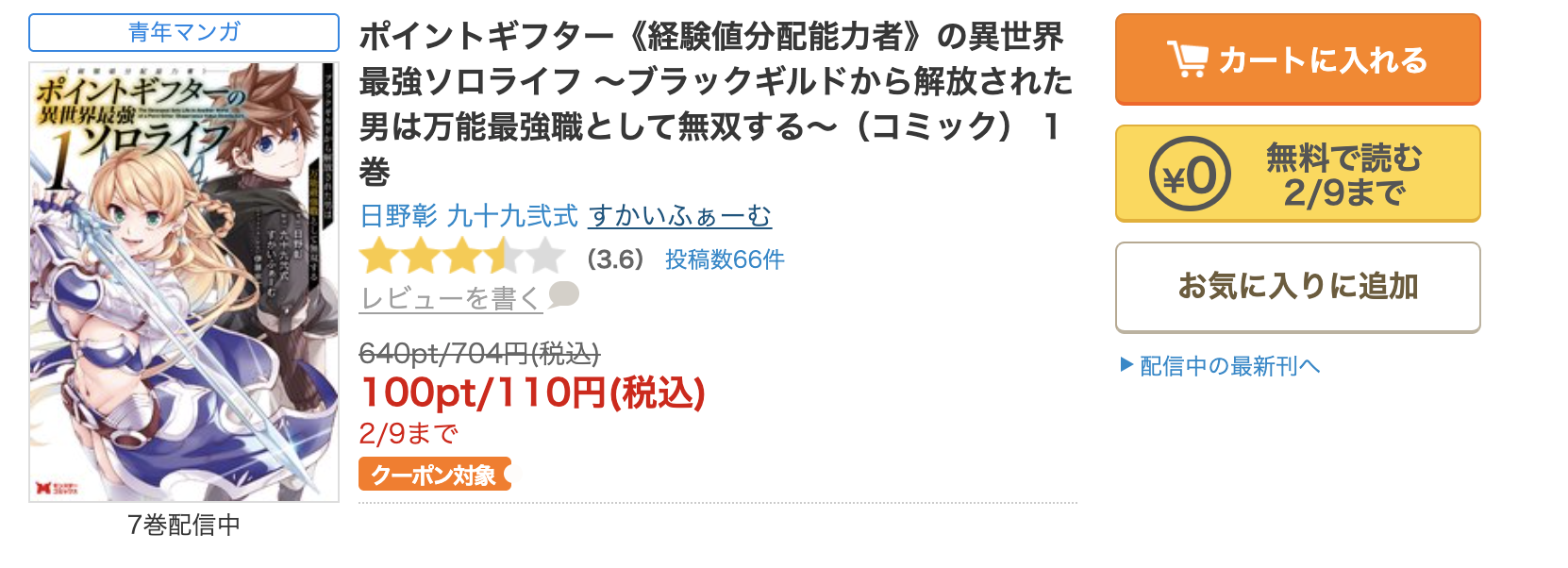 以上の手順で、漫画《ポイントギフター《経験値分配能力者》の異世界最強ソロライフ ~ブラックギルドから解放された男は万能最強職として無双する~》を安く読むことができます。
