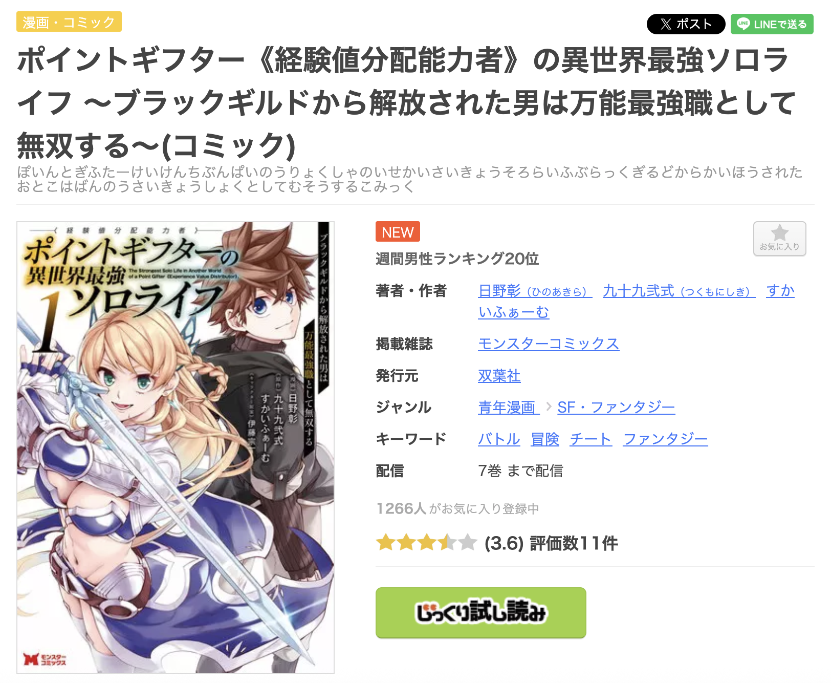 漫画《ポイントギフター《経験値分配能力者》の異世界最強ソロライフ ~》を全話無料(全巻無料)では読めませんが、めちゃコミなら1話〜2話を無料で読むことができます。
