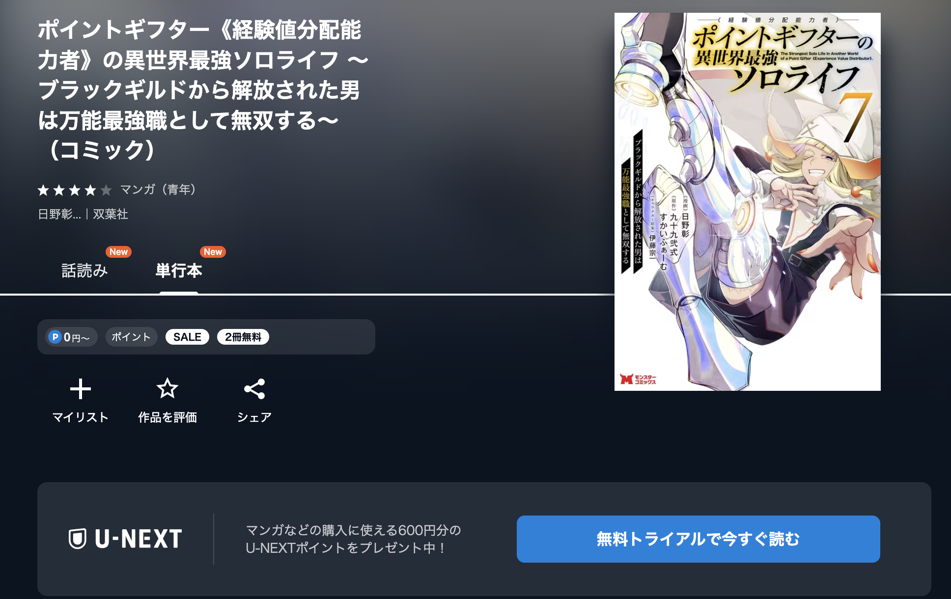 全巻無料で読めなくても、「最新刊だけでも無料で読みたい」というあなたのために、漫画《ポイントギフター《経験値分配能力者》の異世界最強ソロライフ ~ブラックギルドから解放された男は万能最強職として無双する~》の最新刊(7巻)を無料で読める電子書籍サイトやマンガアプリがあるか調査しました。