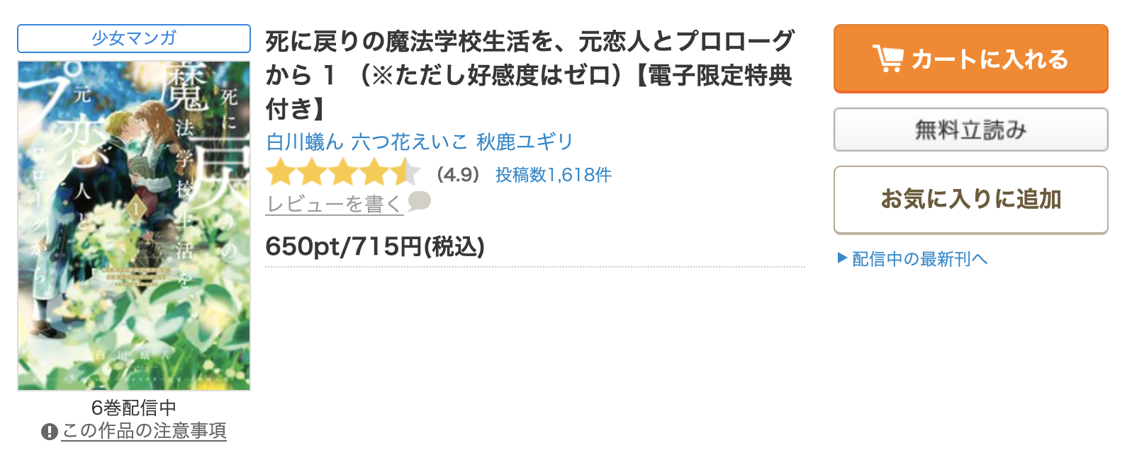 現在、漫画《死に戻りの魔法学校生活を、元恋人とプロローグから》は6巻まで配信されています。