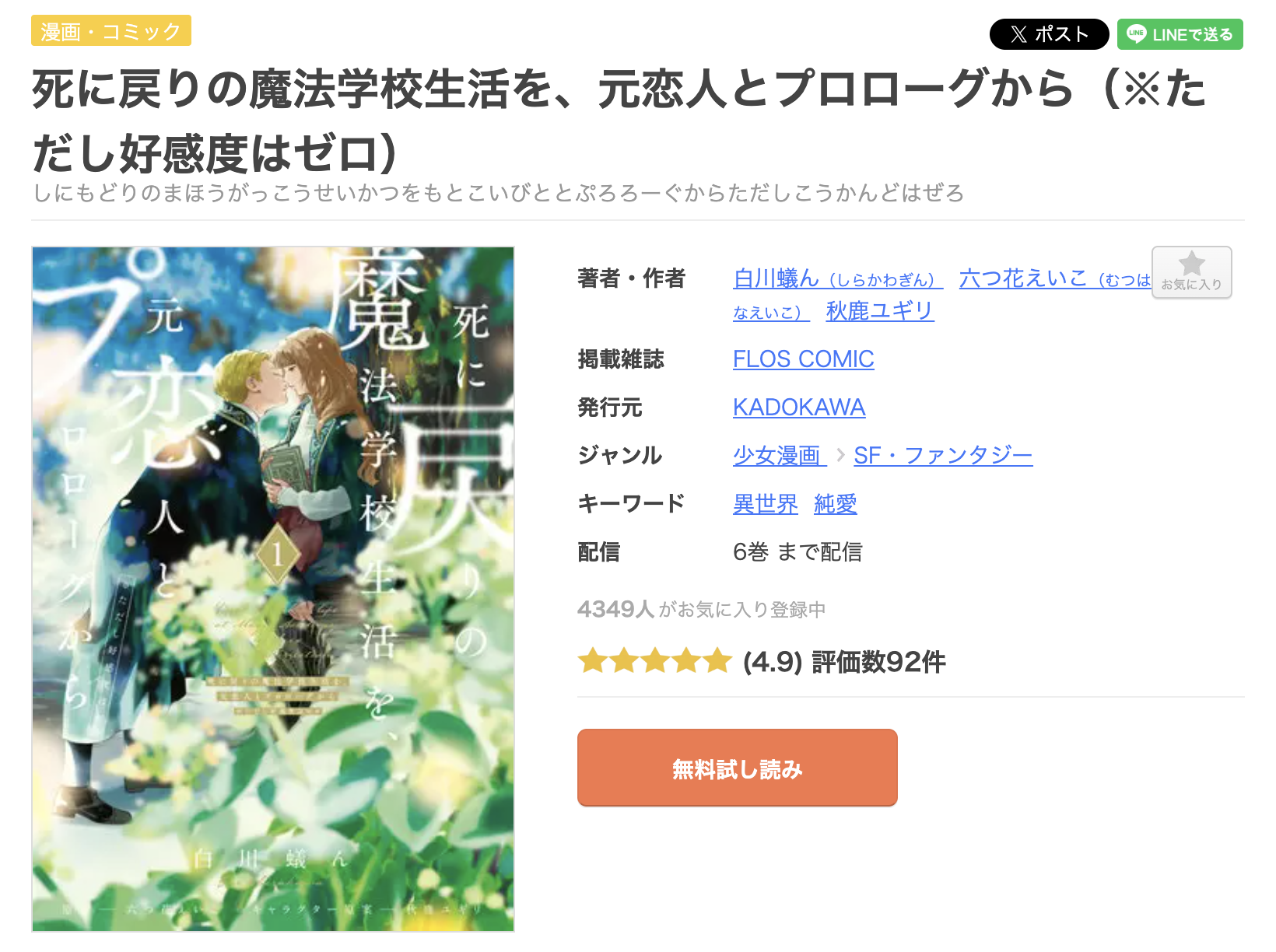 漫画《死に戻りの魔法学校生活を、元恋人とプロローグから》は、FLOS COMICで連載されている漫画で、単行本は全6巻まで発売されています。