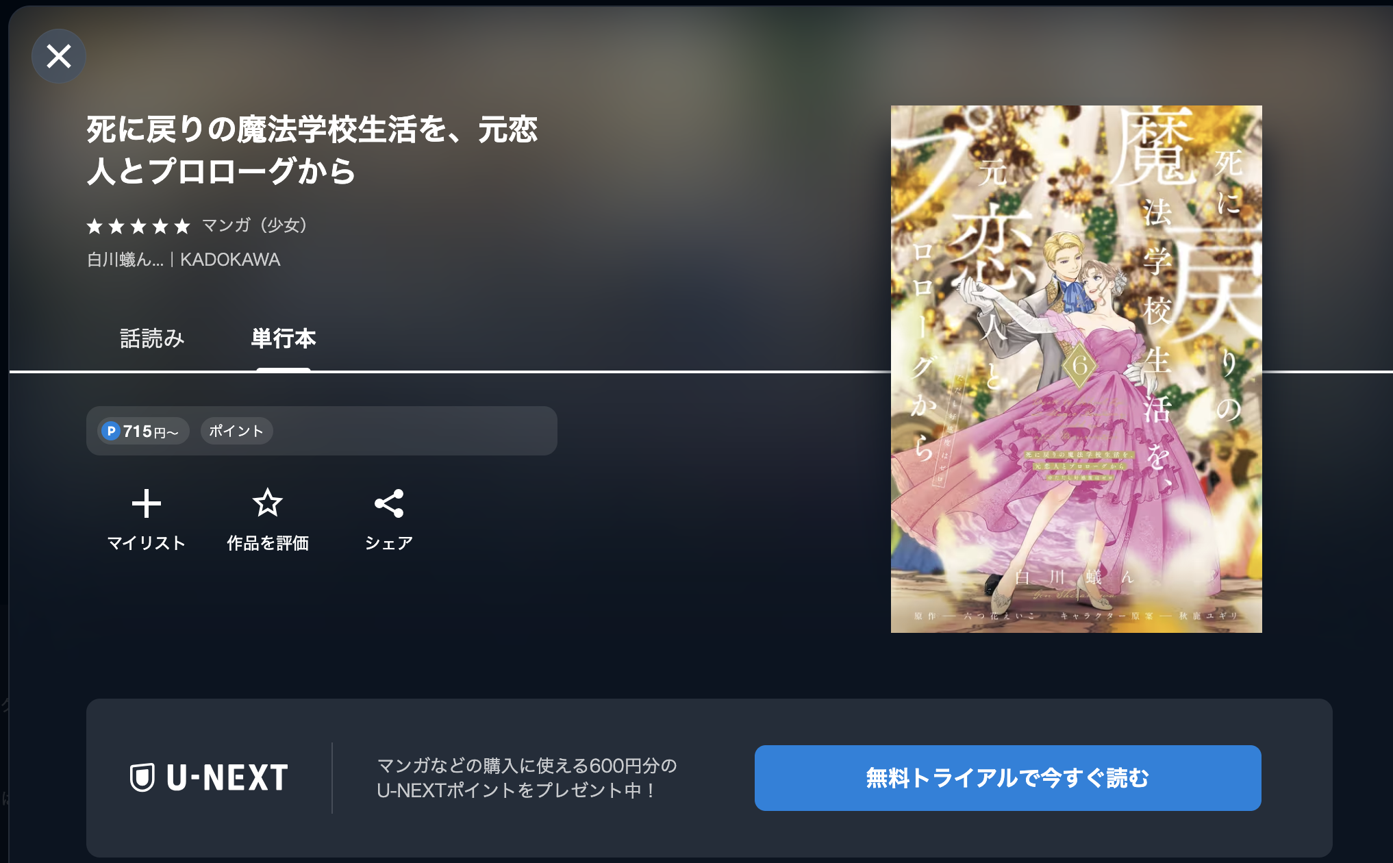 以上の手順で、漫画《死に戻りの魔法学校生活を、元恋人とプロローグから》を600円引きで読むことができます。