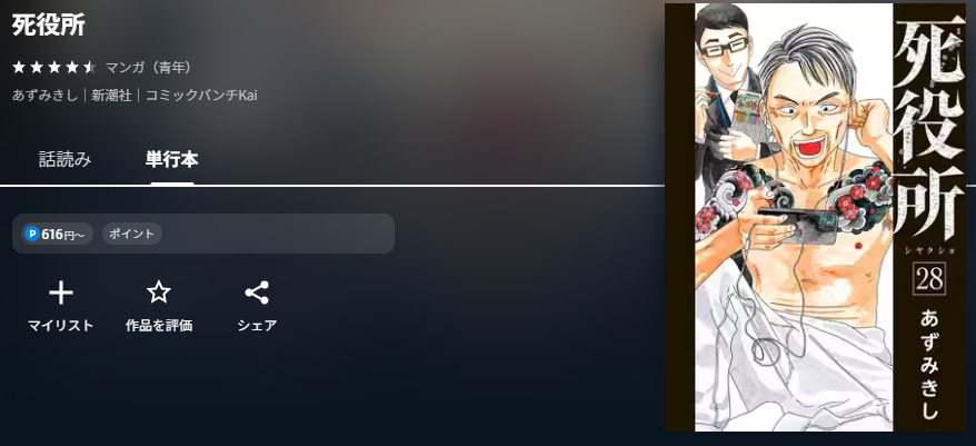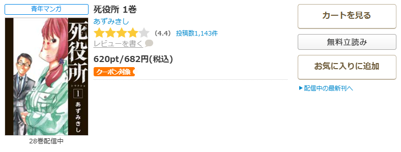 全巻無料ではないものの、クーポンやポイント還元で一番お得に漫画《死役所》を読むことができます。