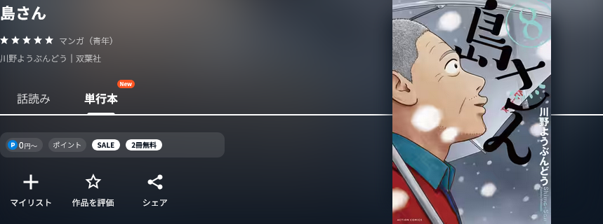 全巻無料ではないものの、クーポンやポイント還元で一番お得に漫画《島さん》を読むことができます。
