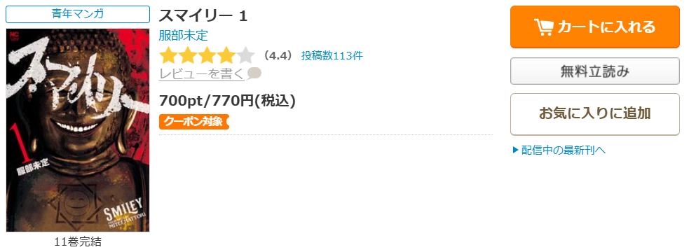 全巻無料ではないものの、クーポンやポイント還元で一番お得に漫画《スマイリー》を読むことができます。