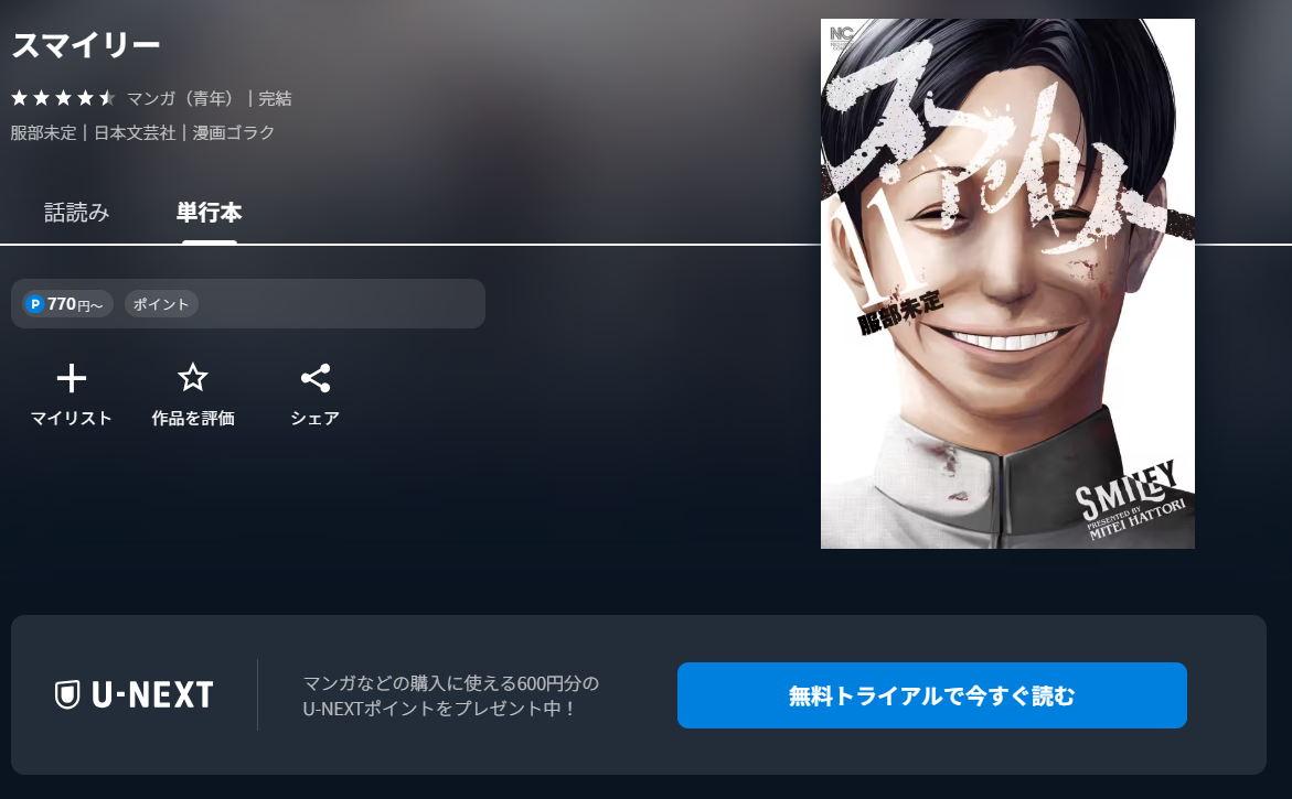 このように、全巻無料では読めませんが、U-NEXTなら初回無料ポイントとポイント還元でお得に漫画《スマイリー》の全巻をまとめ買いできますよ。