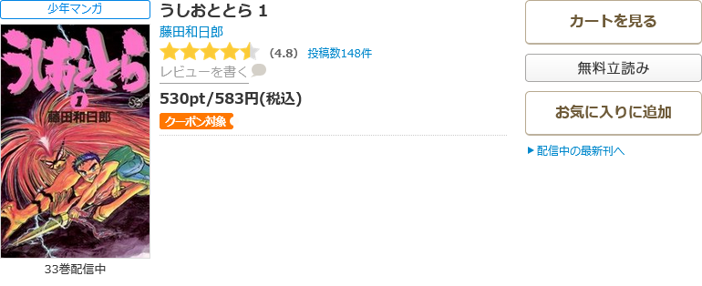 全巻無料ではないものの、クーポンやポイント還元で一番お得に漫画《うしおととら》を読むことができます。