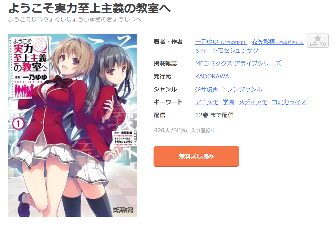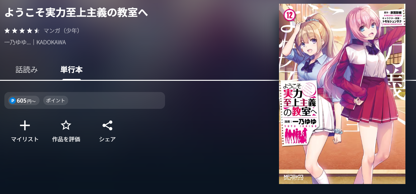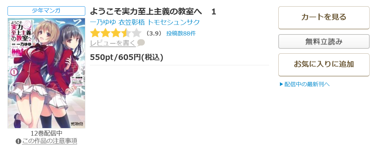 現在、漫画《ようこそ実力至上主義の教室へ(よう実)》は12巻まで配信されています。